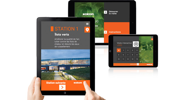 Le siège social du groupe Dicom est un bâtiment écoresponsable ayant obtenu la certification internationale LEED - Leadership in Energy and Environmental Design. Pour mettre en valeur ce formidable lieu de travail, CDC a développé une visite interactive du site sur appareil mobile (cellulaire et tablettes) permettant de découvrir les différentes facettes de l'aménagement écologique.
