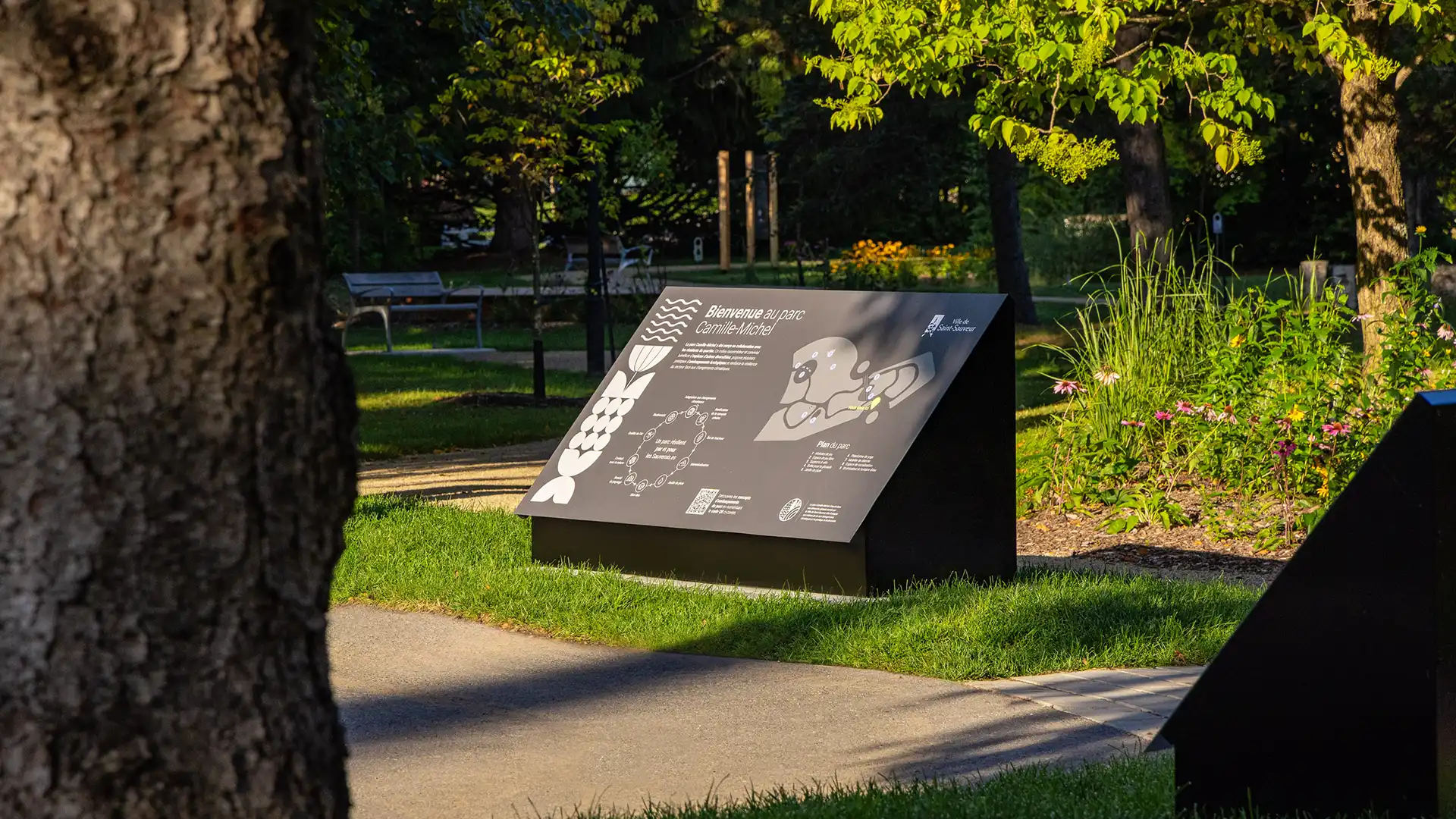 Avec le souci d'en faire un lieu de fierté, respectant de nombreux principes éco-responsables – réduction des îlots de chaleur, augmentation de la biodiversité, gestion de l'eau, ajout d'infrastructure de mobilité active – la Ville de Saint-Sauveur a procédé au réaménagement du parc Camille-Michel. Pour mettre en valeur cette démarche, la Ville a mandaté CDC afin de développer un concept d'affichage intégré de manière discrète dans l’environnement.