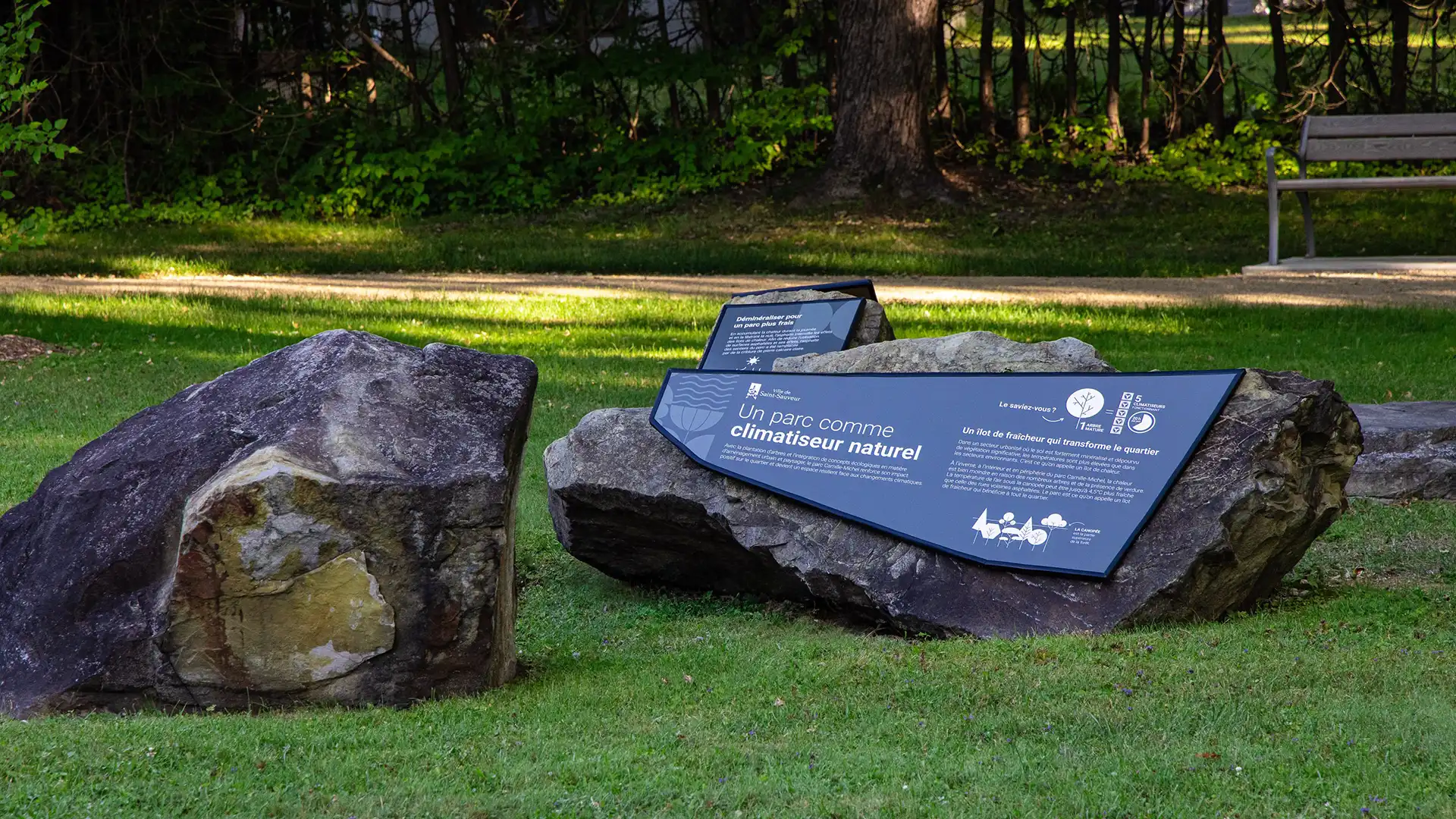 À l’écart des grands sentiers, des inscriptions sur les rochers expliquent le rôle d’îlot de fraîcheur du parc et la déminéralisation dont il a fait objet. Elles laissent l’espace disponible pour s’y asseoir, le temps d’une pause par exemple.