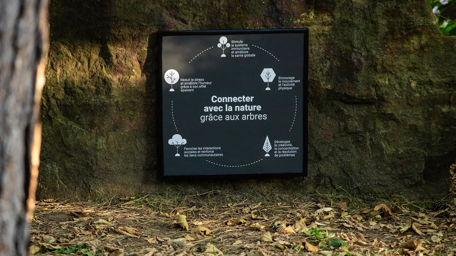 Des rondins de bois portant de petites affichettes invitent à reconnaître les arbres du parc. On peut partir en quête des espèces ou simplement s’y asseoir pour une pause et se connecter à la nature.