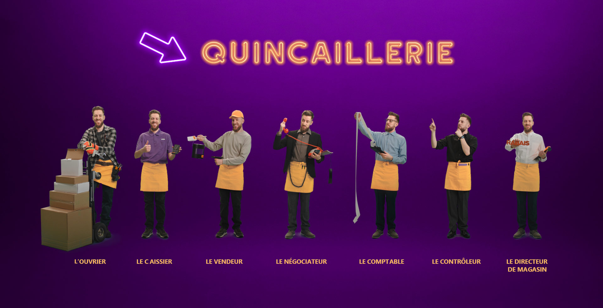 Nous avons souhaité mettre de l’avant la dimension multi-outils du logiciel en incarnant celle-ci de façon imagée, ludique et narrative. Ogasys et ses multiples fonctionnalités ont ainsi été personnifiés à travers un personnage ancré dans l’univers de la quincaillerie, qui endosse différents rôles et costumes : comptabilité, ventes, gestion d’inventaire et d’entrepôts, suivi avec les fournisseurs, bilans et rapports… Autant de tâches que le seul outil Ogasys peut faciliter et prendre en charge au sein de l’entreprise.
